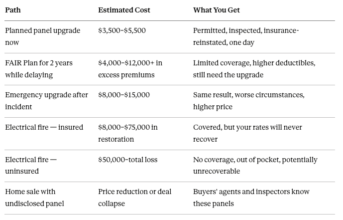 The $3,500–$5,500 number represents a planned, permitted, professionally executed upgrade — the best-case scenario. Every path that involves delay makes that number larger, either through excess insurance premiums, emergency pricing, or the cost of an incident.